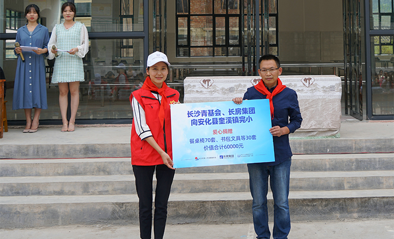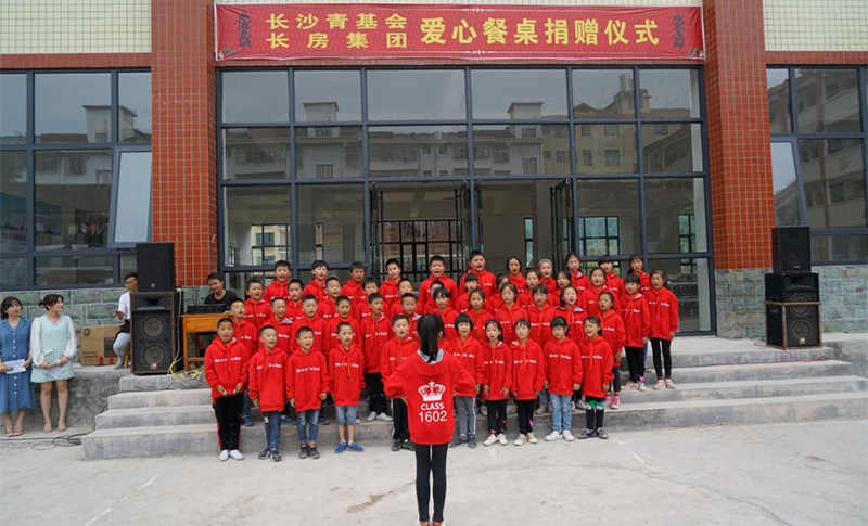 “金色的駝鈴,叮當(dāng)叮當(dāng),小駱駝帶著它走向遠(yuǎn)方,追趕著春天的腳步叮當(dāng),走向綠色的希望?!敝赡矍宕嗟母杪曉诎不h奎溪鎮(zhèn)完全小學(xué)校園里響起,融化著眾人的心。2019年9月25日,長(zhǎng)沙青基會(huì)與長(zhǎng)房集團(tuán)共同舉行的“大愛(ài)奎溪完小、情暖校園食堂”愛(ài)心餐桌椅捐贈(zèng)儀式在安化縣奎溪鎮(zhèn)完小舉行。儀式現(xiàn)場(chǎng),長(zhǎng)房集團(tuán)“藍(lán)絲帶”愛(ài)心傳遞基金向?qū)W校捐贈(zèng)了70套餐桌椅,并給學(xué)校30名貧困學(xué)生帶來(lái)了書(shū)包、文具等新學(xué)期禮物,本次愛(ài)心捐贈(zèng)價(jià)值60000元。長(zhǎng)房集團(tuán)黨群工作部負(fù)責(zé)人,長(zhǎng)沙市青少年發(fā)展基金會(huì)辦公室負(fù)責(zé)人,長(zhǎng)房集團(tuán)十余名青年志愿者,安化縣教育基金會(huì)、奎溪鎮(zhèn)政府、奎溪鎮(zhèn)中心學(xué)校的領(lǐng)導(dǎo)及奎溪鎮(zhèn)完小師生代表出席了捐贈(zèng)儀式。