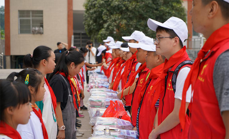 志愿者給貧困學(xué)生送上書(shū)包等文具