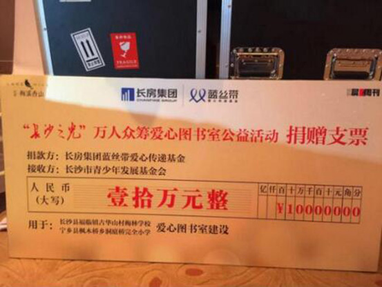 2016年初,晨報周刊攜手長房梅溪香山、長房集團藍絲帶愛心傳遞基金共同發(fā)起“萬人眾籌圖書館”愛心公益活動,為湖南貧困山區(qū)學(xué)校捐建圖書室。以點亮希望之光、傳遞溫暖力量為主題的“長沙之光”微信文稿每被轉(zhuǎn)發(fā)一次,即為籌建山區(qū)學(xué)校愛心圖書室捐贈5元?;顒娱_展以來,贏得了許多社會愛心人士的熱烈反響和廣泛共鳴,共有1萬余人次參與活動,最終,通過長房集團藍絲帶愛心傳遞基金捐款10萬元,用于長沙縣福臨鎮(zhèn)古華山村梅林小學(xué)和寧鄉(xiāng)縣灰湯鎮(zhèn)洞庭橋完全小學(xué)兩所貧困學(xué)校愛心書屋的建設(shè),長沙市基少年發(fā)展基金會理事長羊舒麟代表兩所學(xué)校接收捐贈。